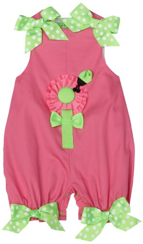 This outfit is perfect for the coming warmer months. Hot pink twill bubble is trimmed with layers of green grosgrain ribbon ruffles and bows galore. Matching ribbon flower with ladybug accent completes the look. Fits 0 - 6 Months.